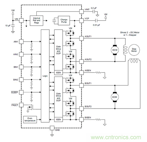 •电机驱动器具有集成型FET和电流感应比较器,可采用最少的分立式组件实现轻松的设计和较小的解决方案尺寸;