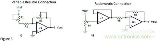 图3b中引入了运算放大器U2,使得电位器工作在比例模式,从而可以消除图3a中的缺陷。运算放大器U2提供了高的输入阻抗从而减小了接触电阻的影响。随着电位器位置的变动,运算放大器U2的输出电压从0V到Vref之间精确变化。给运算放大器U3提供一个精确的电压范围,从而只需给R5、R6设定一个固定的阻值,而且不需要对电路进行增益调节。