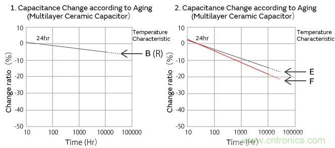 高诱电系的积层陶瓷电容器的静电容量,以经过125℃以上的热处理24小时后的值作为基准,与时间成对数关系直线性下降。请参考如下村田制品静电容量老化特性的代表例子。