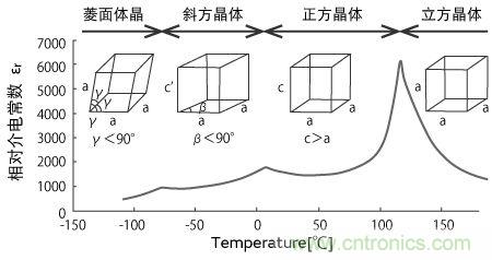 BaTiO3系陶瓷电容器加热到居里点以上时,结晶构造由正方晶系转变成立方晶系。冷却到居里点温度以下时,结晶构造由立方晶系转变成正方晶系。(图2)