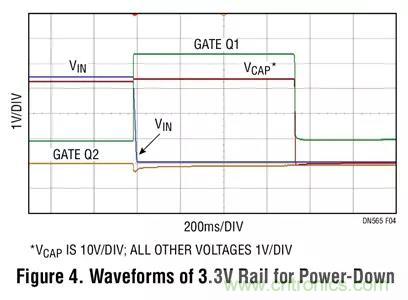 图 4 示出了失去 3.3V 电压轨时的波形。当输入电压下降时,Q2 的栅极电压保持不变 (接近于地电位),而且 Q2 处于关断状态。与此相反,Q1 的栅极电压则急剧上升至 3.3V。这把 Q1 关断,由 Q1 的体二极管起隔离二极管的作用,从而使负载与输入分离。此时备份电源接管供电,LTC3643 通过释放存储电容器的电能以给关键的负载提供3.3V。