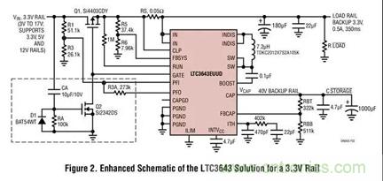 于是,就有了 LTC3643,它能使我们采用一种相对便宜的储能元件——低成本电解电容器。本文将介绍的是一款电路,它使 LTC3643 用作针对 3.3V 电压轨的备份电源解决方案。