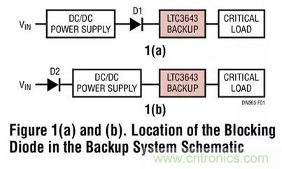 LTC3643 可容易地适用于 5V 和 12V 电压轨的备份解决方案,但是 3.3V 电压轨解决方案则需要格外谨慎。LTC3643 的最小工作电压为 3V,比较接近于 3.3V 的标称输入电压电平。如图 1a 所示,当采用一个隔离二极管以使备份电压电源与非关键的电路分离时,这种余量就太严紧了。如果 D1 是一个肖特基二极管,其正向压降 (作为负载电流和温度之函数) 会达到 0.4V 至 0.5V,足以把 LTC3643 VIN 引脚上的电压置于 3V 最小值以下。因此,备份电源电路可能无法启动。