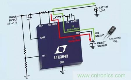 在这里提及的备份电源或保持电源中,当电源存在时,LTC3643 把存储电容器充电至 40V,而当电源中断时,LTC3643 则把该存储电容器的电能释放给关键的负载。负载 (输出) 电压可设置为介于 3V 和 17V 之间的任何电压。