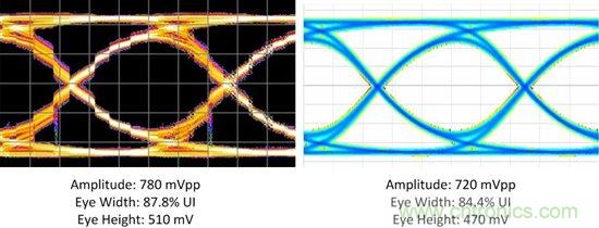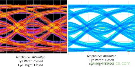 DS125BR820在笔者的系统输出端打开了眼图。图2所示的实例1表明有足够的余量,看来DS125BR820能补偿更多的通道损耗同时使眼图仍能保持开启状态。图3所示的实例2展示了相反的情况:笔者的通道有太多的损耗,在这些运行条件下笔者很可能会看到误码,除非在通道的末端使用接收芯片的均衡功能。