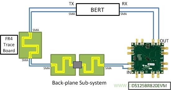 这一切听起来很棒,但该工具能给您带来可靠的结果吗?为了回答这个问题,笔者去了实验室,并进行了一些测量。笔者决定使用一个速率为12.5Gbps的Linear re-driver DS125BR820EVM、一些FR4印刷电路板(PCB)走线以及具有SMA连接器、适用于背板子系统的子卡。图1展示了笔者的简单设置。使用一个误码率测试器(BERT)作为为本次研究的发送器及接收器)。