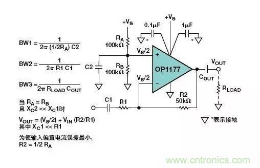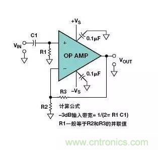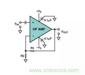 图12.单电源同相输入放大器电路正确的电源退耦方案。中频增益=1+R2/R1