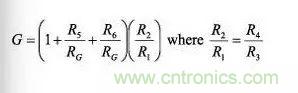 在该电路中,由于两只输入电阻器之间的失配和(或)两端输入偏置电流的失配会产生一个小的失调电压误差。为了使失调误差最小,在仪表放大器的两个输入端之间可以再接一只电阻器(即桥接在两只电阻器之间),其阻值大约为前两只电阻器的1/10(但与差分源阻抗相比仍然很大)。