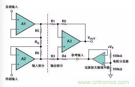 图9.利用低输出阻抗运算放大器驱动仪表放大器的参考电压输入端