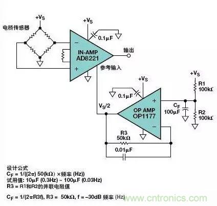 上面示出的CF试用值能够提供大约0.03 Hz的–3 dB极点频率。接在R3两端的小电容器(0.01 μF)可使电阻器噪声最小。