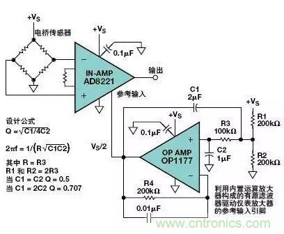 图11.将运算放大器缓冲器接成有源滤波器驱动仪表放大器的参考输入引脚