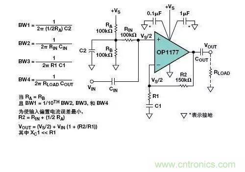最后,单电源运算放大器电路需要偏置共模输入电压幅度以控制AC信号的正向摆幅和负向摆幅。当从电源电压利用分压器提供偏置电压时,为了保证PSR的性能就需要合适的退耦。