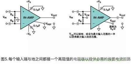 这两只电阻器为输入偏置电流提供了一个放电回路。在图5所示的双电源例子中,两个输入端的参考端都接地。在图5b所示的单电源例子中,两个输入端的参考端或者接地(VCM接地)或者接一个偏置电压,通常为最大输入电压的一半。