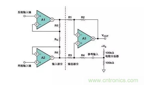 例如,流行的仪表放大器设计配置使用上图所示的三运放结构。其信号总增益为