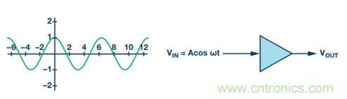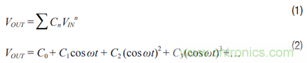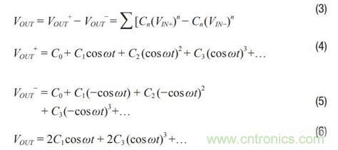 差分信号可抑制偶数阶谐波。以下展示了连续波(CW)通过一个 增益??榈氖纠?。当使用一个单端放大器时,如图2所示,输出 可表示为公式1和公式2。