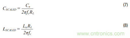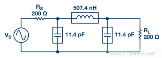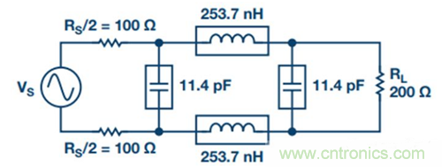 CSCALED为最终电容值。LSCALED为最终电感值。Cn为低通原型电容元件值。Ln为低通原型电感元件值。RL为最终负载电阻值。fc 为最终截止频率。C1SCALED = 1.433/(2π × 100 × 106 × 200) = 11.4 pFL2SCALED = (1.594 × 200)/(2π × 100 × 106) = 507.4 nHC3SCALED = 11.4 pF