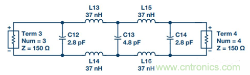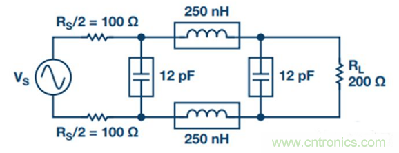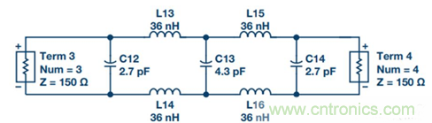 2. 将单端滤波器变为差分滤波器。源阻抗和负载阻抗保持不变,所有电容并联,所有串联电感减半并放在另一差分路径中(参见图17)。