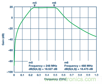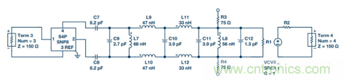4. 对于子系统级仿真,应在输入端增加ADL5201 DGA S参数文件,并使用压控电压源来模拟滤波器输出端的 AD6641 ADC。为将低通滤波器变为带通滤波器,增加两个分流电感:L7与C9并联,L8与C11并联。C12代表AD6641输入电容。R3和R4是放在AD6641输入端的两个负载电阻,用作滤波器的负载。AD6641输入为高阻抗。调谐后的情况参见图19。