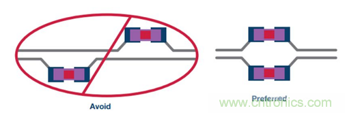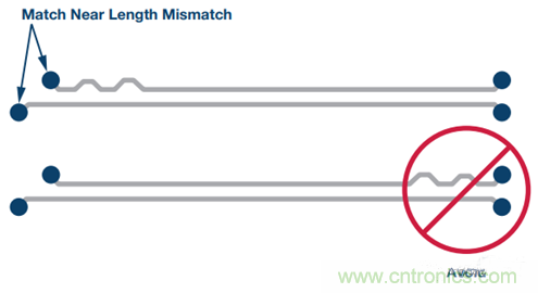 成对差分走线的长度须相同。此规则源自这一事实:差分接收器检测正负信号跨过彼此的点,即交越点。因此,信号须同时到达接收器才能正常工作。