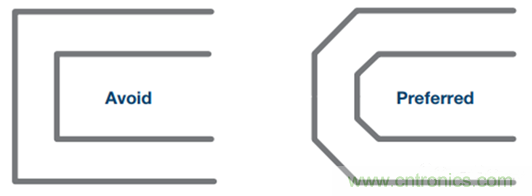 差分对布线时,应避免急转弯(90°)(参见图23)。