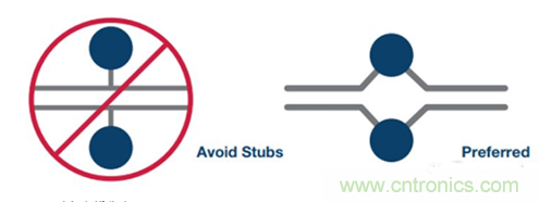 差分对布线时,应使用对称布线(参见图24)。若需要测试点, 应避免引入走线分支,而且测试点应对称放置(参见图25)。