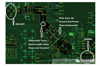 ADI公司接收器参考设计板(参见图26)提供了差分滤波器PCB布局 的一个示例。这显示了ADL5201和AD6649之间有一个五阶滤波 器。AD6649是一款14位250 MHz流水线式ADC,具有非常好的SNR 性能。