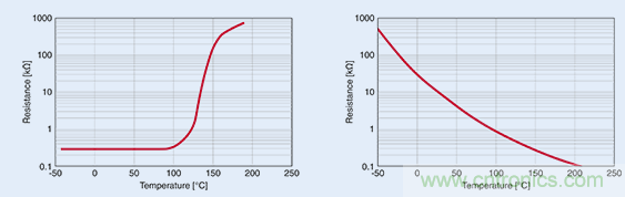 在超出某一特定温度时,正温度系数 (PTC) 热敏电阻(左图)的电阻出现急剧升高,故而适合用作温度限值传感器。而负温度系数 (NTC) 热敏电阻的电阻则呈线性关系,故而适用于温度测量。
