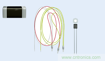 从左至右:安装在印刷电路板上的SMT正温度系数 (PTC) 传感器、与电机绕组进行集成的正温度系数 (PTC) 传感器、安装在散热片上带接线端子的正温度系数 (PTC) 传感器。