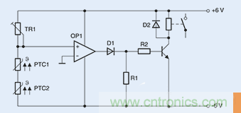 切换原理:记录温度限值图3显示为由两个串联正温度系数 (PTC) 传感器组成的一个简单电路,。TR1与两个正温度系数 (PTC) 传感器组成一个分压器,该分压器能够提供运算放大器的非反相输入,而运算放大器则充当比较器的角色。