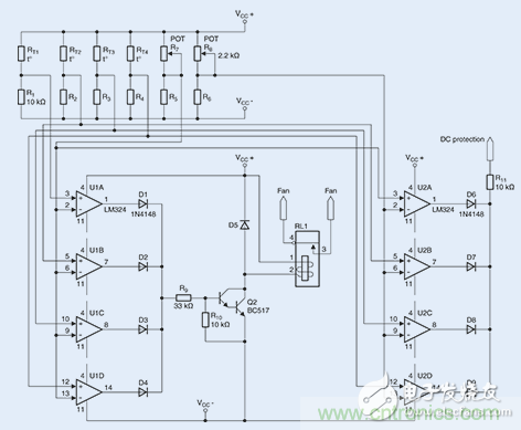 用于监测两个热区的电路:例如,当超过温度限值后,一台风扇将自动开启。