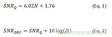 例如,要使抽取因子为2,必须让信号的过采样因子至少为2。在这个例子中,信号功率保持不变,但奈奎斯特带宽被减半。这就消除了一半的噪声功率,从而让该ADC的SNR增加了3dB。第一个方程式表示因量化噪声得到的理想SNR,其中N是该转换器的位数。第二个方程式则表示与抽取因子D相关的SNR改善值。