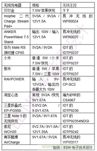 EDN电子技术设计的编辑对比了11款流行的无线充电器,整理出他们的主控芯片: