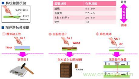 相对于传统触摸按键,新的触摸功能按键可以透过10mm厚度的亚克力材料或者木板进行感应,具有更加坚固的耐久性,无需使用触摸感应弹簧。它与轻触按键相比,耐久性增强,并且具有抗污防水能力,可以大大降低按键的错误率。
