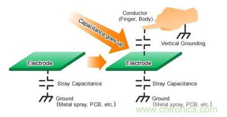 如上图所示,为电容自感应方式,自感应方式是检测电容量的增加,当按下键时,电容量将增加。潮湿的表面也会增加电容率,造成按键误触,如下图所示。