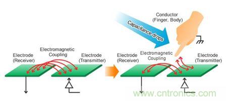 如下图所示,在电容互感方式下,是检测电容量的减少,来判断按键是否按下。