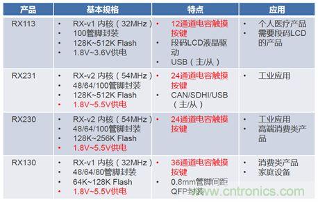 瑞萨电子提供4个产品系列,来适用于不同的应场合,分别为RX113、RX130、RX230、RX231。