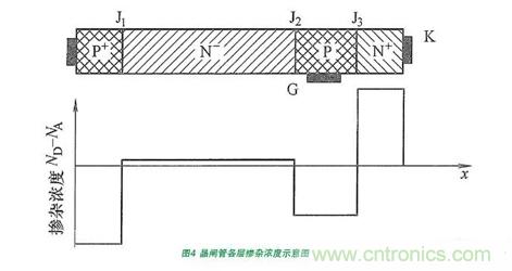 晶闸管各部分的掺杂浓度如图4所示。其中与阳极和阴极相连的分别为重掺杂的P+和N+层,与门极相连的重掺杂P+层,此三层的厚度(在图中体现为宽度)都较小,剩下的一层为相对轻掺杂的层N-层,其厚度较大,而厚度较大的轻掺杂对器件的耐压和通态特性都有显著的影响。