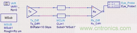 前面说到,铜箔的粗糙度会影响到信号完整性,那么我们就来做一个实验看看。原理图如下所示,把铜箔粗糙度的设置为一个变量,初始值为0,仿真的速率为10Gbps: