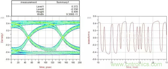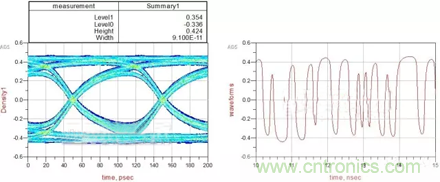 从结果可以看到:眼图的宽度为97ps,高度为0.652V,信号的峰值为0.479V。