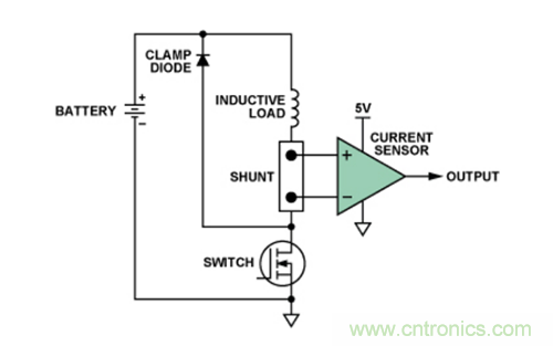 本例将详细介绍一种典型的高端电流检测应用。图1所示为汽车应用环境中用于监控电磁阀或其它感性负载的常见配置。