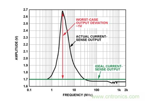 图2所示为输入在较宽频率范围内变化时电流传感器的直流输出与其理想值的偏差情况。从图中可以看出,在1 MHz至20 MHz的频率范围内,偏差最为显著(>0.1 V),且3 MHz时直流误差达到最大值(1 V),这在放大器0 V至5 V的输出电压范围中占据很大比例。