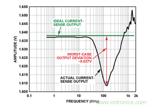 这种情况下,40 MHz时误差仅为3 mV左右,且峰值误差(大于100 MHz时)小于30 mV,性能提高35倍。这点清楚地表明,内置EMI滤波电路有助于显著提高电流传感器防护性能,使其免受输入端存在的高频信号影响。在实际应用中,尽管并不清楚EMI的严重程度,但是如果使用内置EMI滤波功能的电流传感器,实际上控制环路将会保持在其容差范围内。