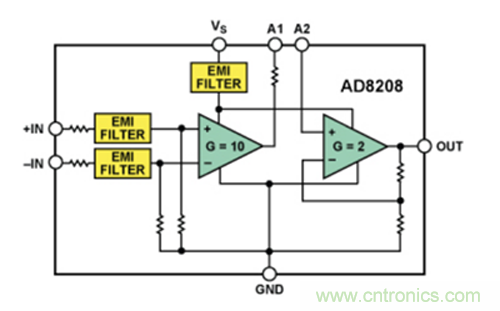 AD8208的更多详情:AD8203(图A)是一款单电源差动放大器,非常适合在大共模电压情况下放大和低通滤波小差分电压。采用+5 V单电源供电时,输入共模电压范围为-2 V至+45 V。该款放大器提供增强的输入过压和ESD保护,并内置EMI滤波功能。