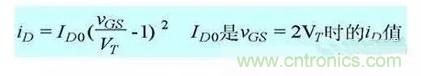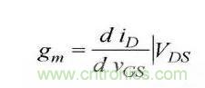在转移特性曲线上,gm 是曲线在某点上的斜率,也可由iD的表达式求导得出,单位为 S 或 mS。