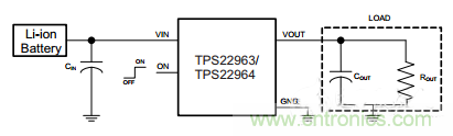 TI负载开关是用来接通和关闭电源轨的集成电子中继器。大多数基本负载开关采用小型集成封装,由四个引脚组成:输入电压、输出电压、使能、和接地,并且包含多重特性,其中有反向电流?;?。图4显示了一个用来阻断反向电流的负载开关。