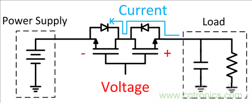 为了在FET关闭时阻断两个方向上的电流,你还可以将FET背靠背连接。与二极管解决方案相比,电源到负载的压降更低,不过这种实现方式占用了大量的电路板面积。图3显示了用来阻断反向电流的背靠背FET示例。