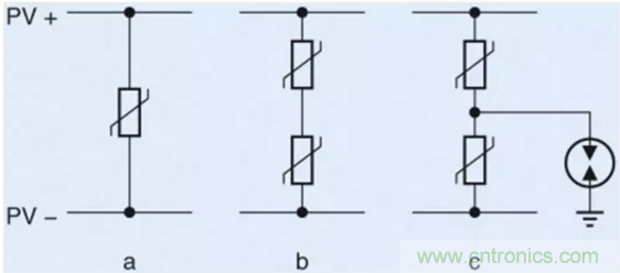 额定电压为1000 V DC的金属氧化物压敏电阻通常用于太阳能逆变器的直流输入。根据待处理线路电压,例如电压为300 VRMS的压敏电阻可以是变频器输出的首选。在这两种情况下,也可使用充气式气体放电管以实现额外防护。图2为太阳能逆变器直流输入的常用电路设计:最简化版本(图2a)仅使用一个额定电压为1000 VRMS的压敏电阻(例如片状,直径20毫米)。在这种情况下,额定直流电压为1414 V DC,而钳位电压在100 A时为2970 V。图2b所示电路通过串联的两个压敏电阻运作,两元件应专用于550 VRMS (745 V DC),以提供相同?;?。这一设计提供了一大优点:钳位电压在电流为100 A时仅为2710 V,从而进一步抑制过电压。此外,待吸收能量将平均分布于两个组件,从而降低负荷系数。图2c所示电路则在压敏电阻与地面之间添加了一个气体放电管。这一设计仍将提供充分?;ぃ乇鹗堑钡ジ龌蛄礁鲅姑舻缱璩鱿止收匣蛞蚋汉傻贾吕匣?。必须使用气体放电管,以免当两个压敏电阻同时故障时进入持续导电状态。