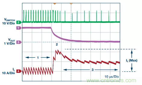 最初,峰值电感电流由选定的电感值、电源开关导通时间、电路的输入和输出电压以及负载电流设置(图中用“1”表示)。当电路短路时,电感电流迅速上升,直至达到限流点,即 RS × IINDUCTOR (IL)等于最大电流检测电压,以?;て骷拖掠蔚缏罚ㄍ贾杏?ldquo;2”表示)。然后,内置电流折返限制(图中数字“3”)进一步降低电感电流,以将热应力降至最低。