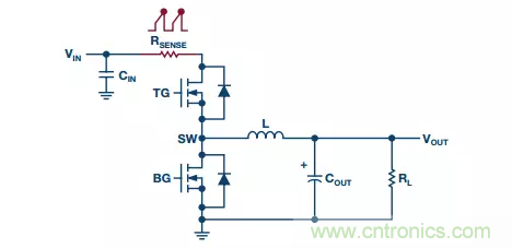 对于降压调节器,电流检测电阻有多个位置可以放置。当放置在顶部MOSFET的高端时(如图3所示),它会在顶部MOSFET 导通时检测峰值电感电流,从而可用于峰值电流模式控制电源。但是,当顶部MOSFET关断且底部MOSFET导通时,它不测量电感电流。