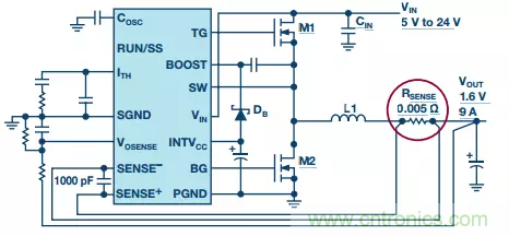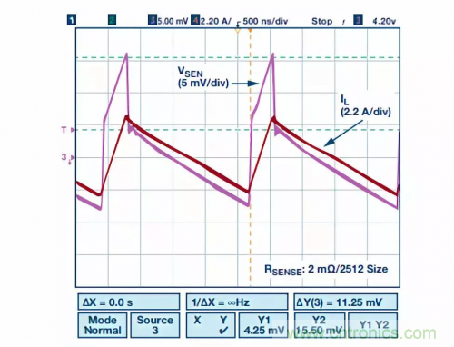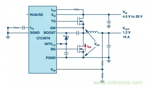 图4中,检测电阻位于底部MOSFET下方。在这种配置中,它检测谷值模式电流。为了进一步降低功率损耗并节省元件成本,底部FET RDS(ON)可用来检测电流,而不必使用外部电流检测电阻RSENSE。